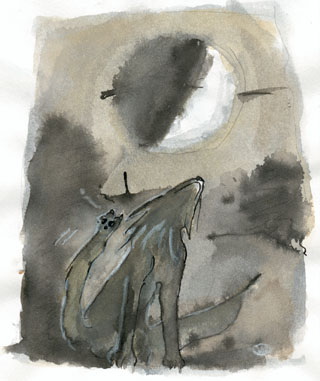 de la lueur vacillante du feu de camp.Rassuré par la mort des flammes, il s'enhardissait, rôdant de plus en plus près des dormeurs... le croc luisant sous la lune. Gaspard le larron -Dieux, il avait l'oreille fine- réveillé en sursaut par un bruit sauvage de mastication, amena son compère Ysago Di Niau le Gros-Matagot à s'éveiller... Trop tard... - Oh NON ! quémisère! Les provisions... ... Le mal était fait : sur le sol gisait les restes proprement étripés ... de leur gibecières. - Quelle idée aussi, j'tavais bien dit d'suspendre les sacoches à un arbre, pauv'arsouille ! -cracha Ysago- - Omerdremerde ! La Gemme... - Qwâ, la gemme ? - Ce corniaud de loupiot l'a bouffé avec les faisandeaux... ---La gemme censée mettre fin à la triple malédiction des habitants des Ombrettes... est maintenant par erreur dans le ventre d'un leu...--- extrait des récits