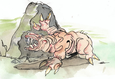| For 2d6+12 (19) Con 2d6+9 (16) Tai 1d6+6 (10) Pou 9 Dex 2d6+9 (16) Armure naturelle : 3 Points de vie : 13 Mouvement: 7 Compétences : Athlétisme 40%, Esquive 30%, Vigilance 65% Combat : Morsure 75% (2d6+2) > Risque de gangrène pour la victime :Virulence 12 |