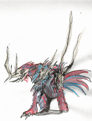 Exemple : Chien d'enfer "mineur" réalisé pour le scénario d'intro "La geole" CON 13 INT 4 POU aucun DEX 10 P.V.: 23 Armure Naturelle :1 Compétences : Athlétisme 45%, Esquive 60%, Vigilance 70%, Discrétion 70% Combat : Griffes 1d3 15%, Morsure 1d6+2 Tête 1: 25% Tête 2: 60% Tête 3: 25% Souffle brûlant (voir au-dessus) 75% |