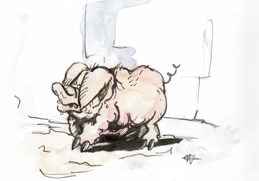Oh certes, ce sont des animaux domestiques placides , en apparence, mais sommes toute imprévisible : on a relaté plus d'un accident, des cas d'enfants ou de lutins aggressés par des porcs, des chevaux s'emballant, parce que bousculé par un goret, sans compter que le jour où l'aubergiste tue le cochon, celà fini souvent en course-poursuite à travers la ville ...