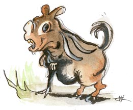 ![]() For 2d6+1 (7) Con 2d6+1 (7) Tai 1d6+1 (4) Int 2-4 Pou 2d6 (3) Dex 3d6+10 (20) Points de vie : 6 Armure naturelle: 3 petite taille (1) + cuir (2) Mouvement : 10-12 (bond) Compétences : Athlétisme 65 %, Discrétion 70 %, Esquive 60 à 90 %, Vigilance 60 à 85 %, siffler les intrus 100% Combat : ruade (1d2-1), morsure (1d3-2) |
